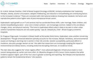 A recent study published in the JAMA Open Network by the National Cancer Registry Programme has identified Hyderabad as India’s breast cancer capital, with an age-adjusted incidence rate of 54.0 per 100,000 women. Dr. Vishvak Chanthar shared his views on the topic and stated that the rise in cases is closely linked to lifestyle changes that accompany modernization—sedentary habits, obesity, alcohol consumption, delayed childbearing, and reduced breastfeeding practices are key contributors. Addressing this challenge requires a proactive, multi-pronged approach. Modern techniques like Oncoplastic breast surgery, Image-Guided Radiation Therapy (IGRT), Intensity-Modulated Radiation Therapy (IMRT) allow experts to provide precise, patient-centered care.