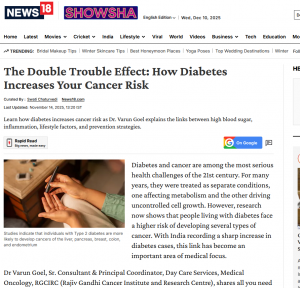 This article by Dr. Varun Goel (Sr. Consultant & Principal Coordinator Day Care Services-Medical Oncology, RGCIRC) explores how diabetes doubles the health burden by increasing the risk of various cancers. Medical experts explain that prolonged high blood sugar, insulin resistance, and chronic inflammation associated with diabetes can significantly elevate the likelihood of cancers such as liver, pancreatic, colorectal, and breast cancer. The article emphasises the critical importance of regular screenings, blood‑sugar control, and a balanced lifestyle for diabetic individuals. It also underscores early detection and preventive care as powerful tools to reduce cancer risk.
